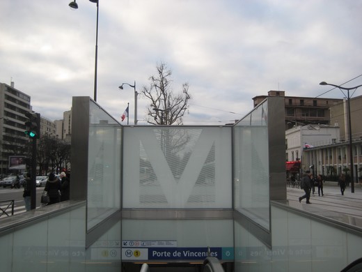 En réponse aux socles carrés des colonnes de Ledoux situés sur la place de la Nation, les artistes Langlands et Bell ont souhaité habiller deux des trémies de la station de métro Porte de Vincennes (ligne 1) de grands cubes de verre moiré rétroéclairés et rehaussés du signal "M". L’œuvre interactive change de couleur au rythme des arrivés et des départs du tramway. Elle constitue aussi un point de repère nocturne, signalant, à cet endroit, un passage souterrain pour les piétons. |